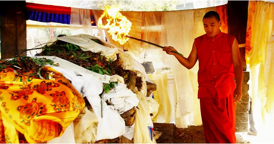 The body of the deceased is typically bathed and dressed in new clothes before the cremation ceremony. A lama or spiritual teacher is usually present to perform the ceremony, which typically involves reciting prayers and making offerings to the gods and ancestors. The body is then placed on a wooden pyre and burned. The ashes and remaining bones are typically collected and either scattered in a sacred place or buried.